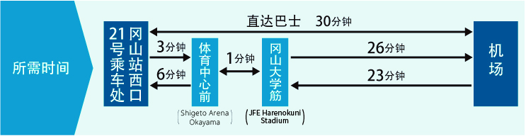 - ※「○」「杜の街」(冈山市北区下石井)为出发站或到达站。(前往机场方向的巴士比冈山站出发时刻表提前20 分钟(「○」:提前15 分钟)出发,前往冈山站方向的巴士比冈山站时刻表晚10分钟到达。)