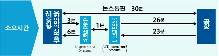 - ※「○」는「모리노마치 (오카야마시 기타구 시모이시이)」를 출발 또는 도착합니다. (공항행은 오카야마역 출발 시각의 20분 전에 (「○」:15분 전에) 출발하며, 오카야마역행은 오카야마역 도착 시각의10분 후에 도착합니다.)